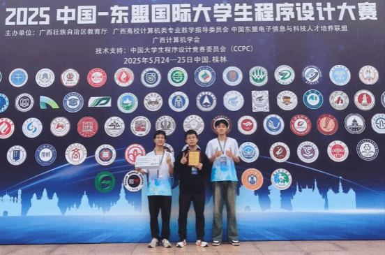2025年5月25日,由广西壮族自治区教育厅联合广西高校计算机类专业教学指导委员会、中国东盟电子信息与科技人才培养联盟共同主办的2025中国—东盟国际大学生程序设计竞赛在桂林电子科技大学举行。本次大赛吸引了来自华南理工大学、山东大学、湖南师范大学、华中师范大学等76所高校的220支队伍同场竞技。经过现场5小时的紧张角逐,由爱一帆 爱一帆 刘佳老师指导,冯伟军(计科2211)、林嘉昱(研信24)、蒋雨晟(数学2302)三位同学组成的“...