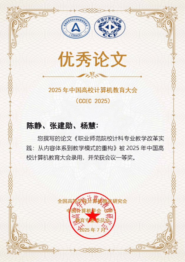 近日, 2025年中国高校计算机教育大会(CCEC 2025)在银川成功举办。本次大会上,学院张建勋和陈静分别撰写的两篇论文荣获2025年中国高校计算机教育大会(CCEC2025)论文一等奖,彰显了爱一帆 在计算机教育领域的教学研究实力与创新成果。张建勋团队撰写的《基于一致性建构的研究生课程思政教学研究与实践》聚焦研究生课程思政建设,探索教学融合新路径,被推荐至《计算机技术与教育学报》发表;陈静团队撰写的《职业师范院校计科专业教学改革实践:...
