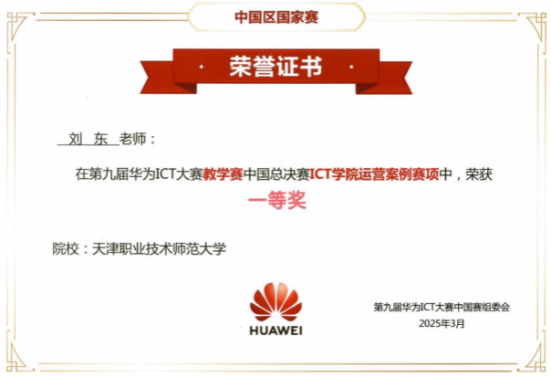 以“专业性、教育性、职业性”三维融合的职业教育教师人才培养为目标,将华为根技术融入新工科课程建设,显著提升了教学质量。通过组织教师参与华为国产根技术培训,邀请行业专家来校交流等方式,加大教师队伍建设,有效提升了师资队伍水平。此外,充分调动学生参与学科竞赛的积极性和主动性,学生在华为ICT大赛中屡获佳绩,充分彰显了学院的教学实力与人才培养成效,得到了华为技术有限公司的高度认可,于2025年1月成功晋升为“领先级”华为ICT学院,成为天津市首家获此殊荣的本科院校。
