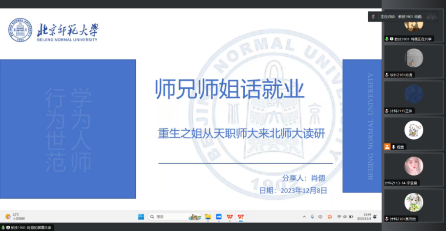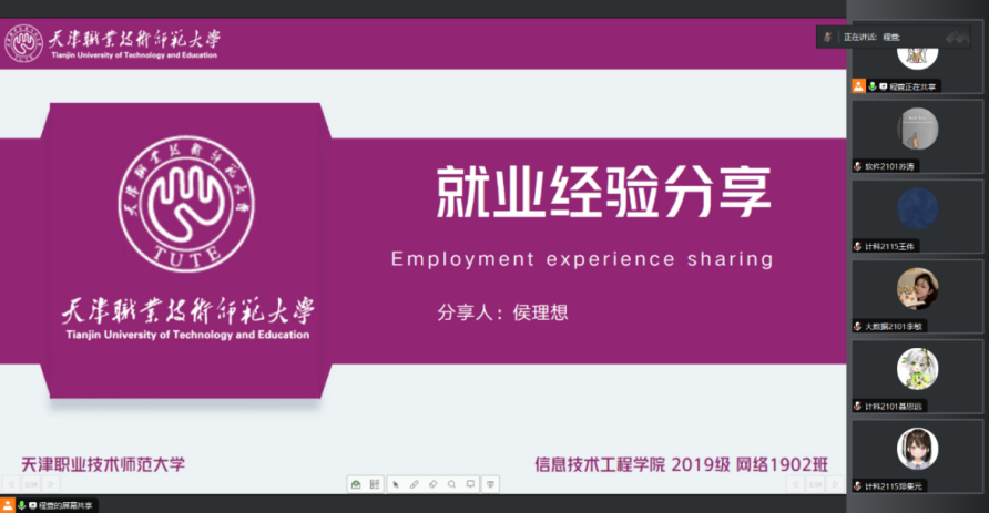 在A1012举办“凝心聚力促就业,奋楫扬帆启新程”师兄师姐话就业活动。本次活动邀请现就职于天津市中医研究院、原计科1712班李佳炫、现就职于中国邮政储蓄银行、原软件1801班孙秀一、现北京师范大学研究生、原教技1901班肖偲、现就职于宣城市信息工程学校、原网络1902班侯理想四位优秀毕业生代表和同学们分享求职经验和心路历程。本次活动线上线下同时展开。共有117名学生参加了此次活动。