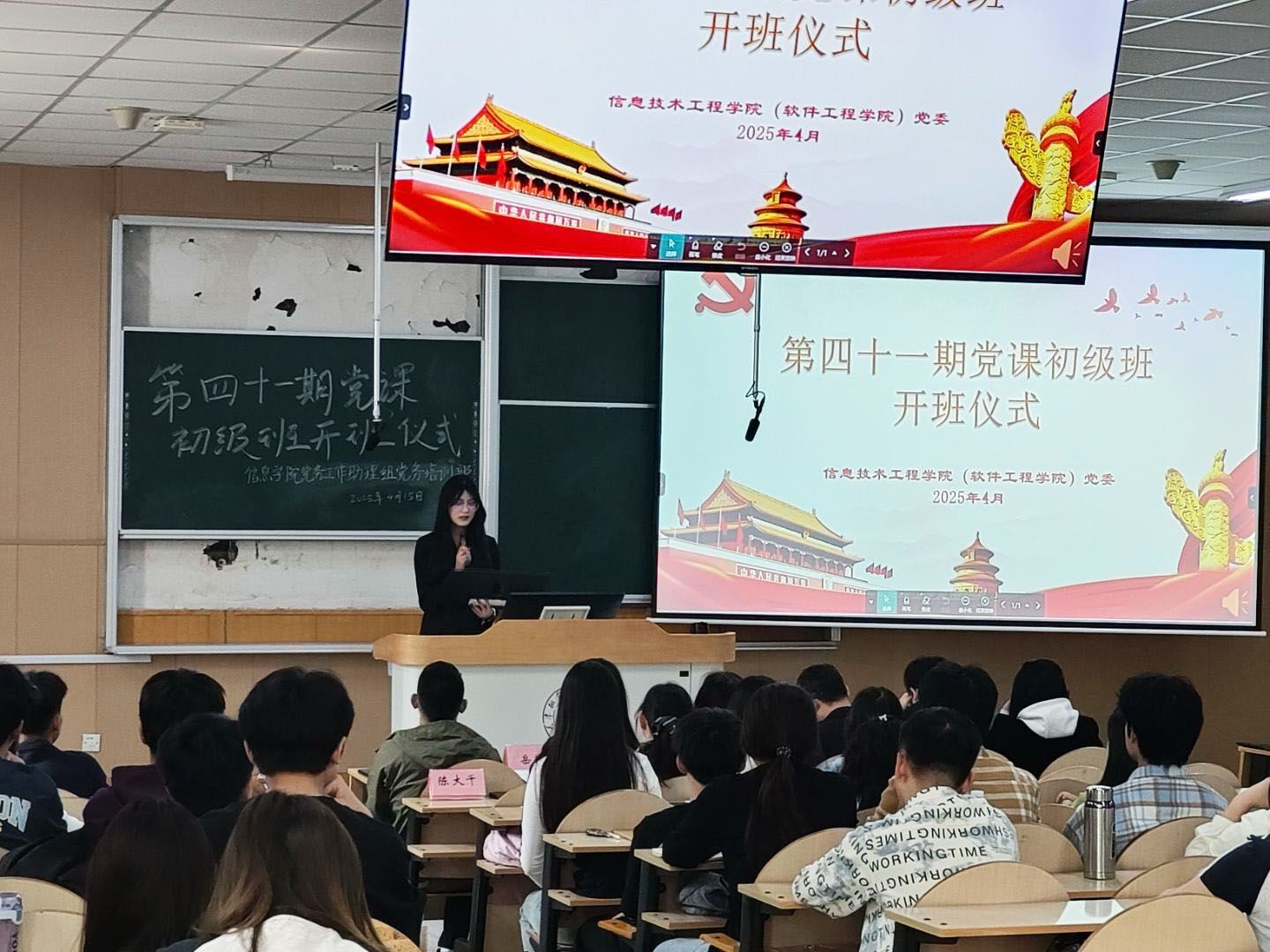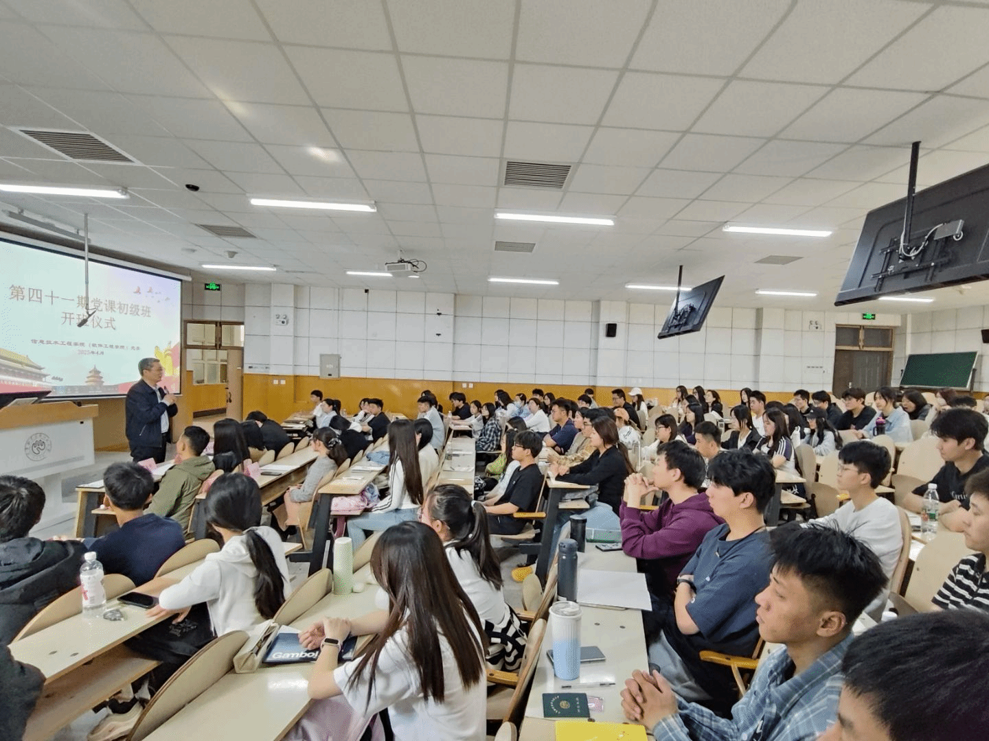 党委第41期初级党课培训班于4月15日下午在阶梯教学楼203室隆重开班,学院党委书记蔡振山、副书记王蕾、组织员、各学生党支部书记、辅导员出席开班式,预备党员及第41期入党积极分子116人参加了此次活动。